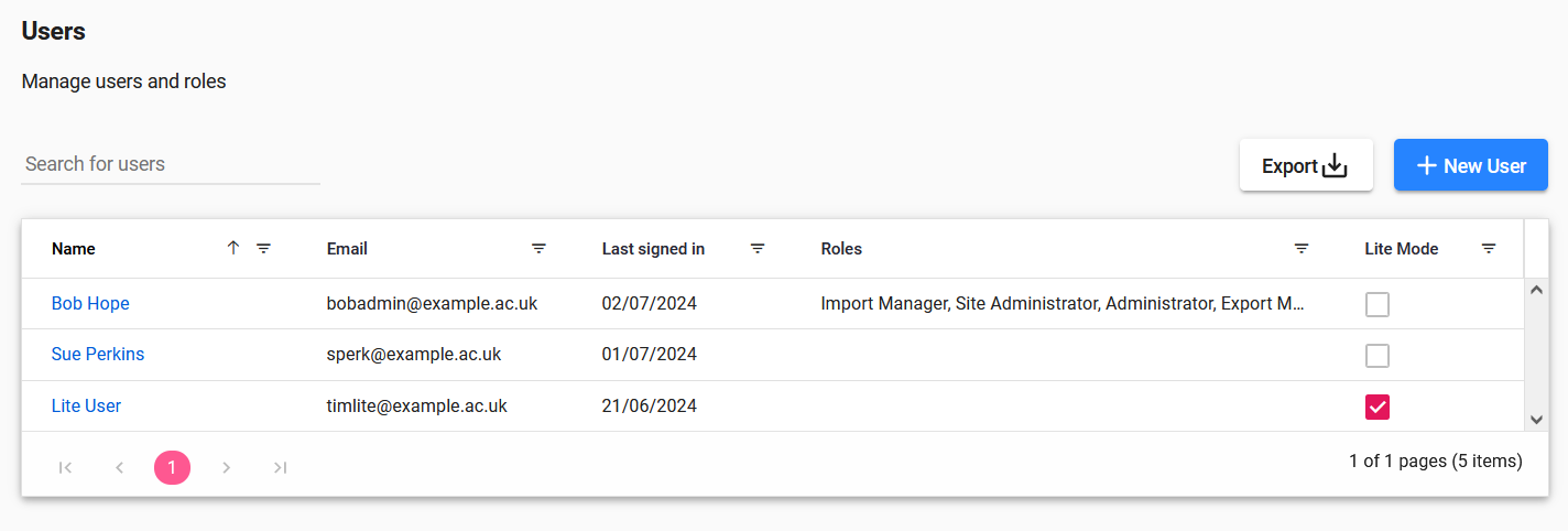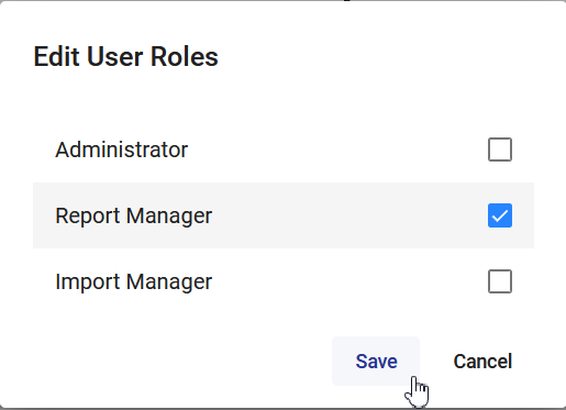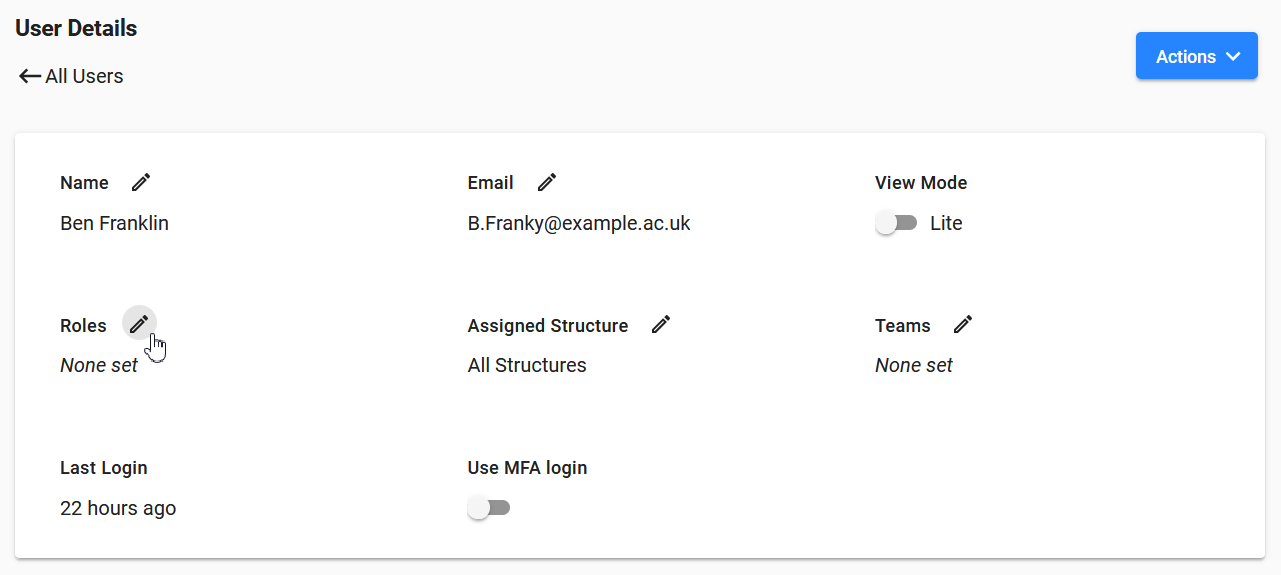 Once a user has been created you can now optionally enable roles, such as the ability to create new reports for themselves or their team, or to import data like new ILRs or structure files. To do this click on the user in the users list to open their details, then find the Roles section as shown: