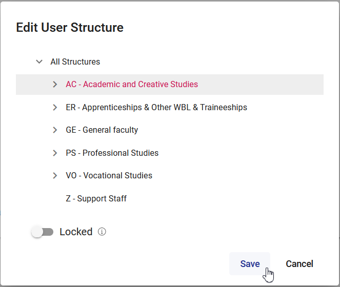 When initially created users are assigned to a default top-level structure, 'All Structures', this means that any reports they view or data elsewhere in the Dashboard or Spotlight screens includes enrolments from your entire structure. However, for convenience you may wish to assign your own user or others to a particular structure, eg a department or curriculum area.
