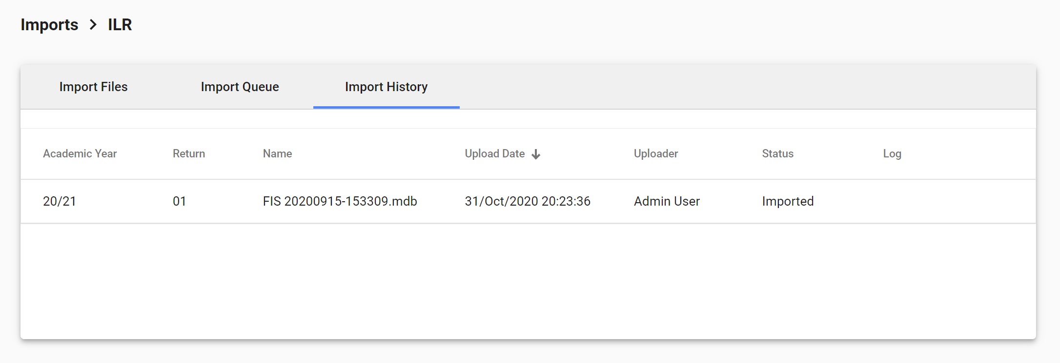 The Import History tab provides a list of all imported files, including; Upload Date, Uploader and Status. If any file fails to import, the Status will show as failed and the Log will given an indication of the error.