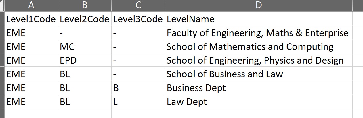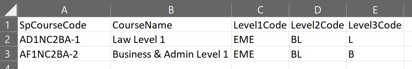 Below are two sample files for a 3 level course and provider structure. When creating the structure files, please ensure you have the header row included as per the examples below.