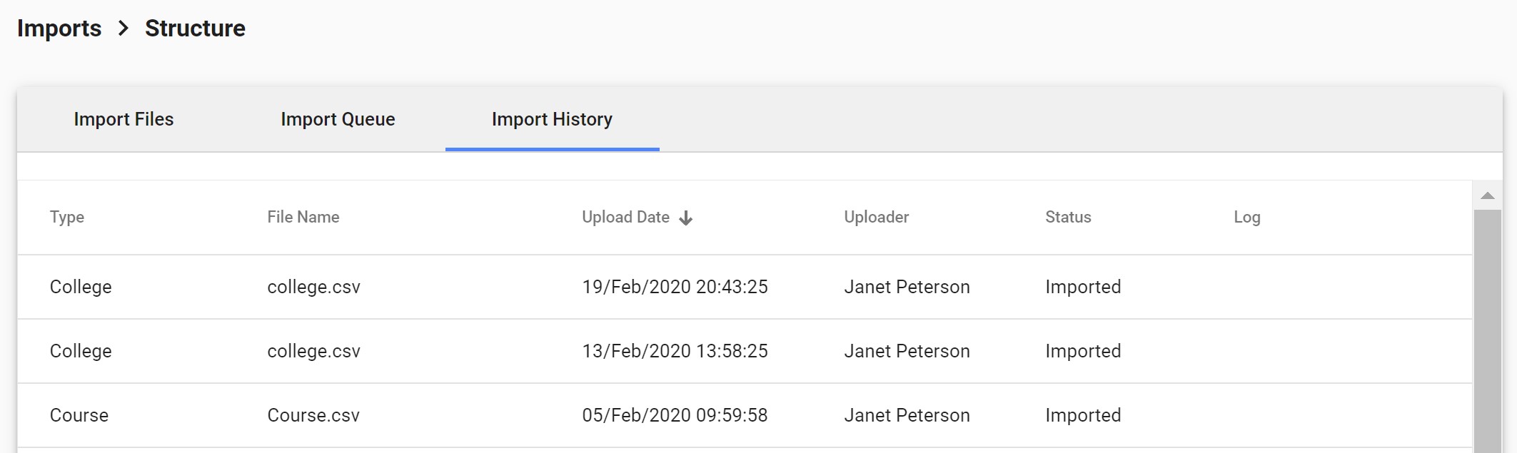 The Import History tab provides a list of all imported files, including; Type,Upload Date, Uploader and Status. If any file fails to import, the Status will show as failed and the Log will given an indication of the error.