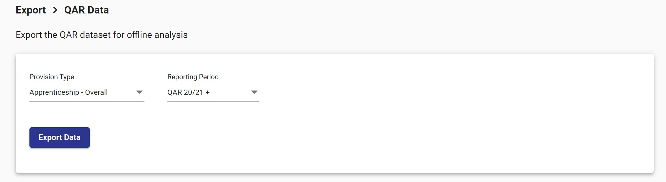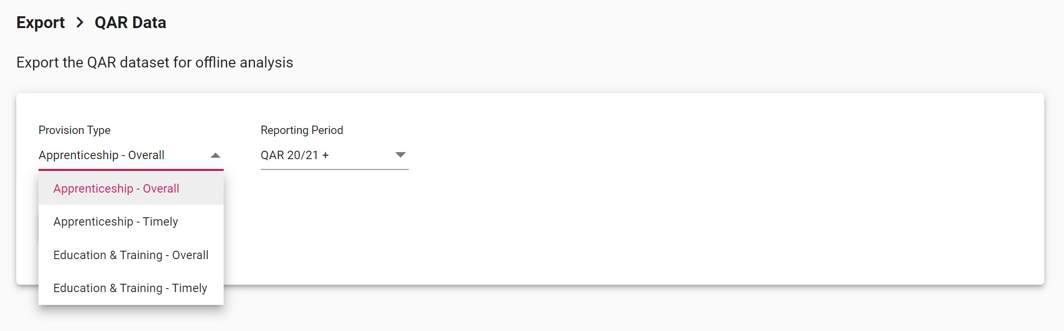 Derived QAR data can be exported to an on-premise csv file for offline analysis. Derived, Overall and Timely data can be exported for both the Education and Training and Apprenticeship provision.