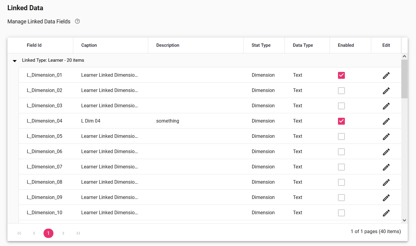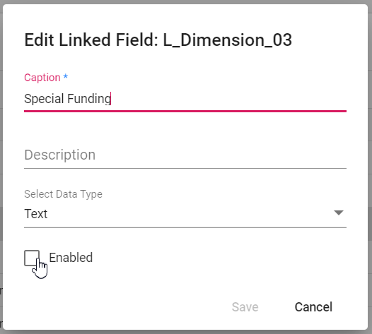 To change a field's visibility and/or caption, click the edit button (pen icon) at the end of the row. This will open a dialog where you can set values and save your settings. Once saved you will see the field as an availble column or criteria (for dimension fields only) within the Report Editor. You are now ready to create reports combining your newly imported linked data with Strata's own standard fields.
