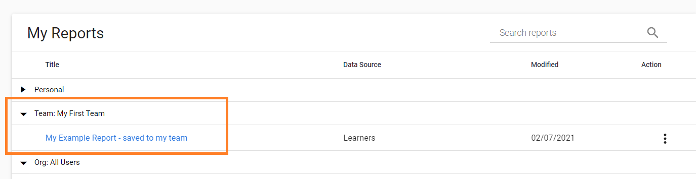 This means that users can now save their reports to their own teams so that their teammates can also see them. They will appear in their 'My Reports' list like so: