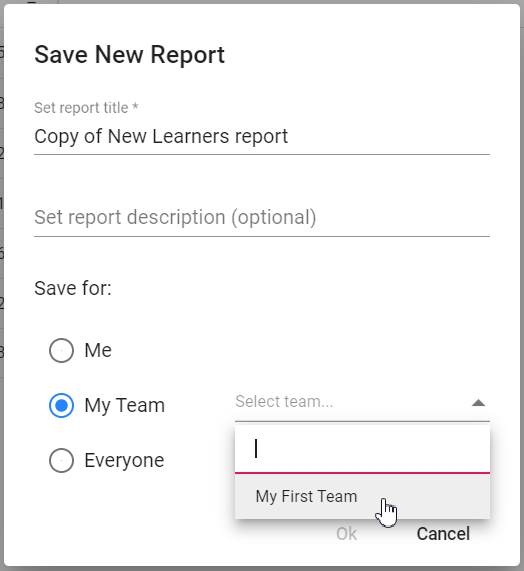 Any of the users you assigned to that team can now choose to save new reports they create to that team. This is how the option will appear in their 'Save Report' dialog