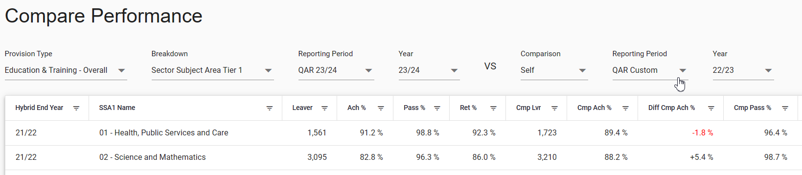 Another area in Strata where you can make use of your new Custom QAR is the Compare Performance screen. Choose comparison option: 'Self' then pick your new Custom QAR. This is a fast and convenient way to see how your current leaver and achievement rates measure up to the period you used for your Custom QAR.